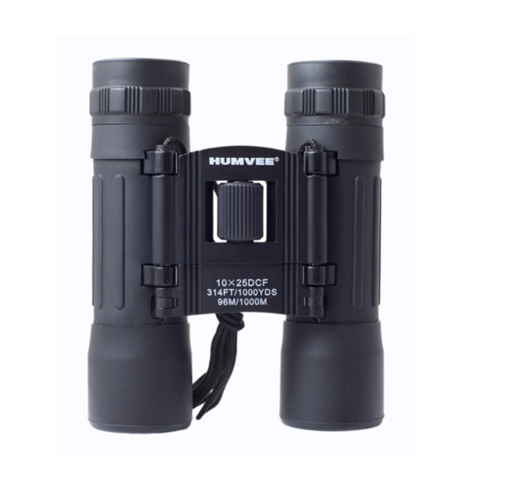 The Humvee 10X25 black, rubber coated, compact binocular combines innovation, technology, and cutting-edge design to provide optical excellence at an exceptional value. This binocular has a 10x magnification, 25mm objective lens diameter, 304-foot field of view at 1000-yards and is designed for long distance observation. Built Humvee tough, this binocular has black rubber coating with no-slip grip, making it very durable and comfortable to use during lengthy viewing sessions. This precision instrument is extremely compact, portable, and ideal for all outdoor activities and sporting events. This optic also features an innovative design and a one-touch center focus and focusing lens. Equipped with anti-reflective light gathering ruby red glass lenses, this optic is great for military use, hiking, bird watching, or hunting, and will crossover from one environment to the next. This binocular includes a carrying case, neck lanyard, and lens cleaning cloth. It measures 4.5'' (L) by 2.5'' (W) by 1.5'' (H), weighs 5.6-ounces, and has the Humvee logo branded on the item. This binocular comes with a 1 year warranty. Humvee has become the backbone of U.S. forces around the world. Our Humvee gear is modeled after equipment that is depended on in the rigors of battle. These products are designed to survive the most demanding situations while still remaining simple and easy to use.